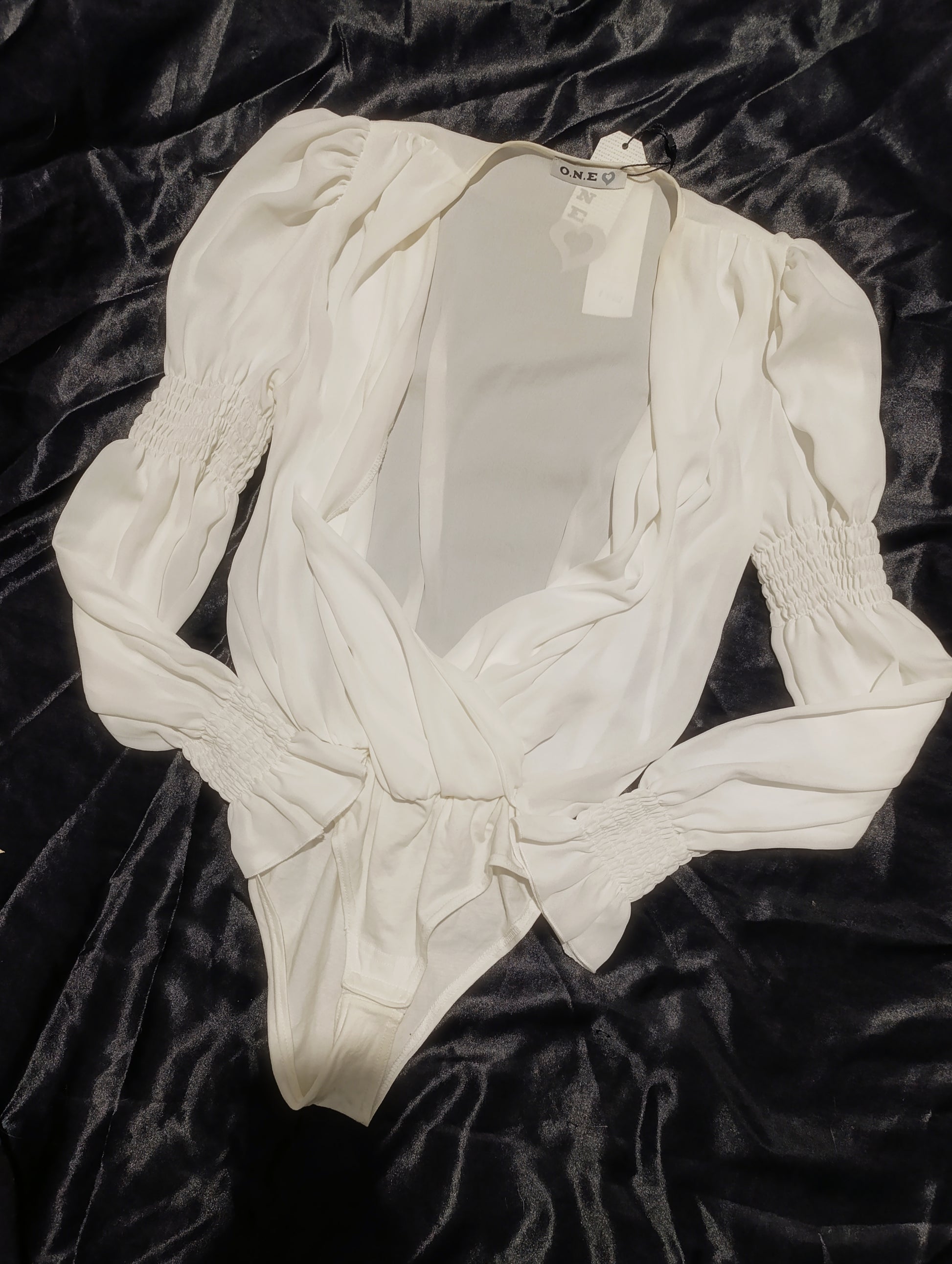 Białe body z bufiastymi rękawami i głębokim dekoltem ˚☽˚.⋆
