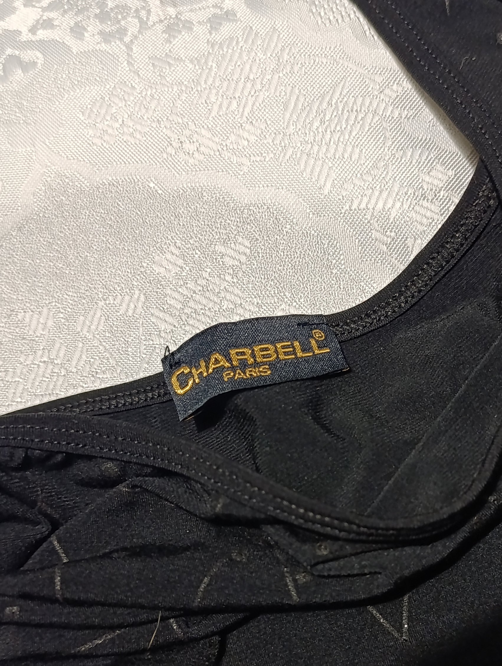 Top o kroju na jedno ramię z marszczeniem po drugiej stronie, wykonany z materiału w delikatnie połyskujący, geometryczny wzór ₍^. .^₎⟆