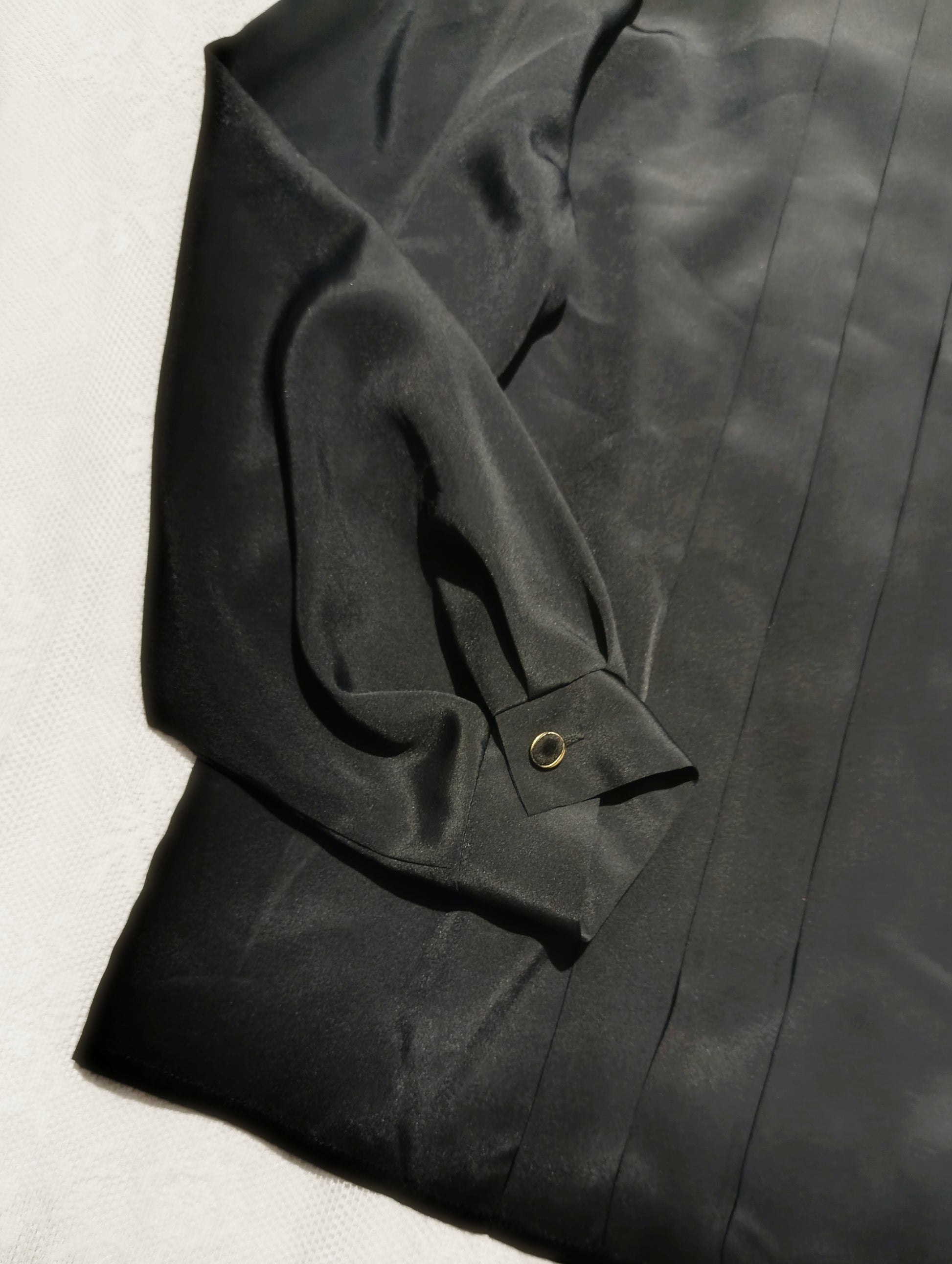 Elegancka koszula vintage z wysokim kołnierzem, bufiastymi rękawami oraz dekoltem i mankietami zapinanymi na pozłacane guziki 𓋹