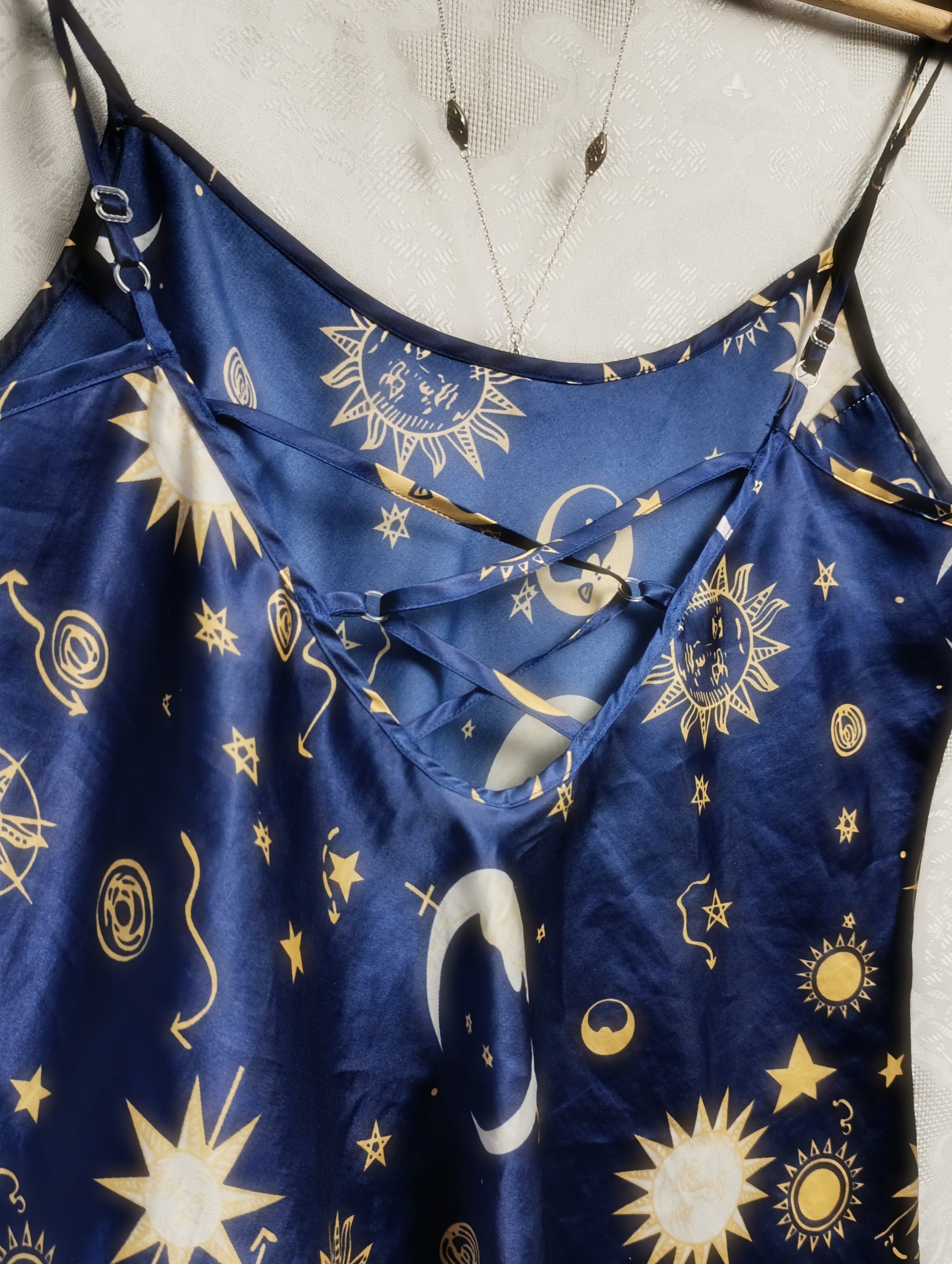 Vintage satynowa koszulka nocna z motywami gwiazd, księżyców, spiral i słońc, z ozdobnym wiązaniem na plecach ⊹₊⟡⋆