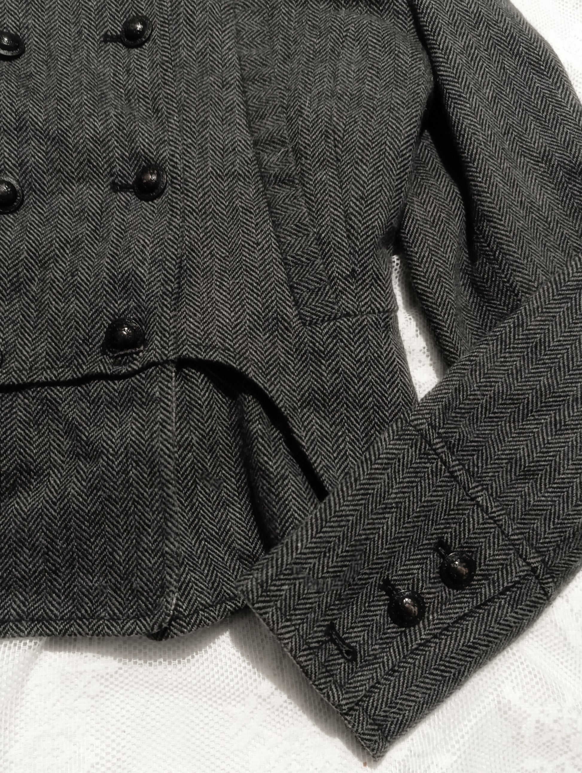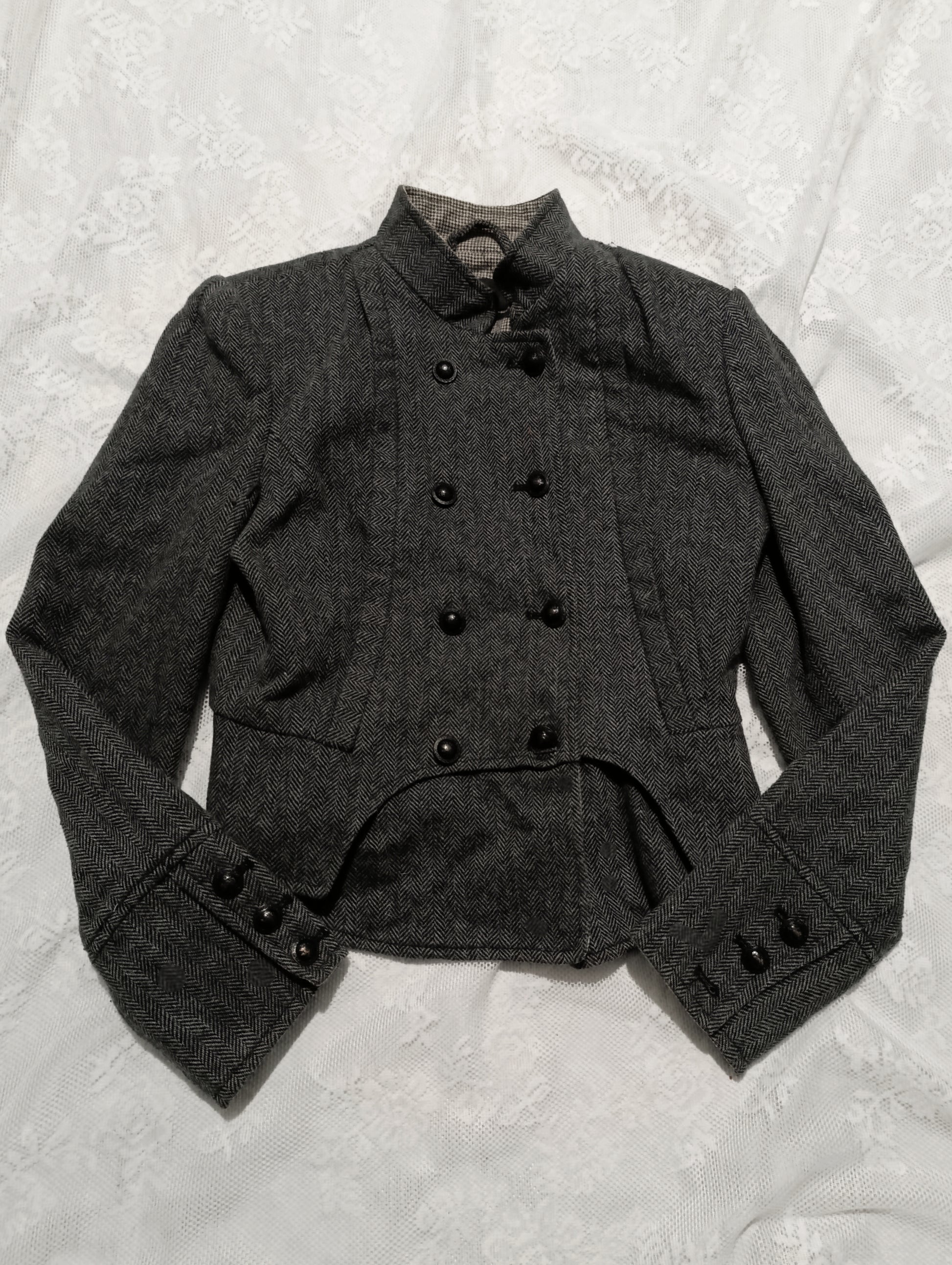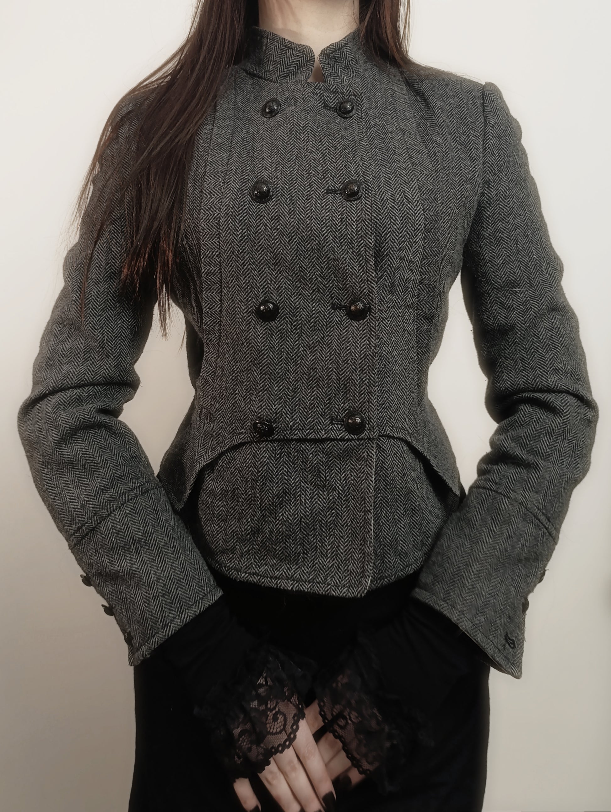 Kurtka w jodełkę, zapinana na dwurzędowe guziki i pod szyję, o klasycznym kroju 𓏵