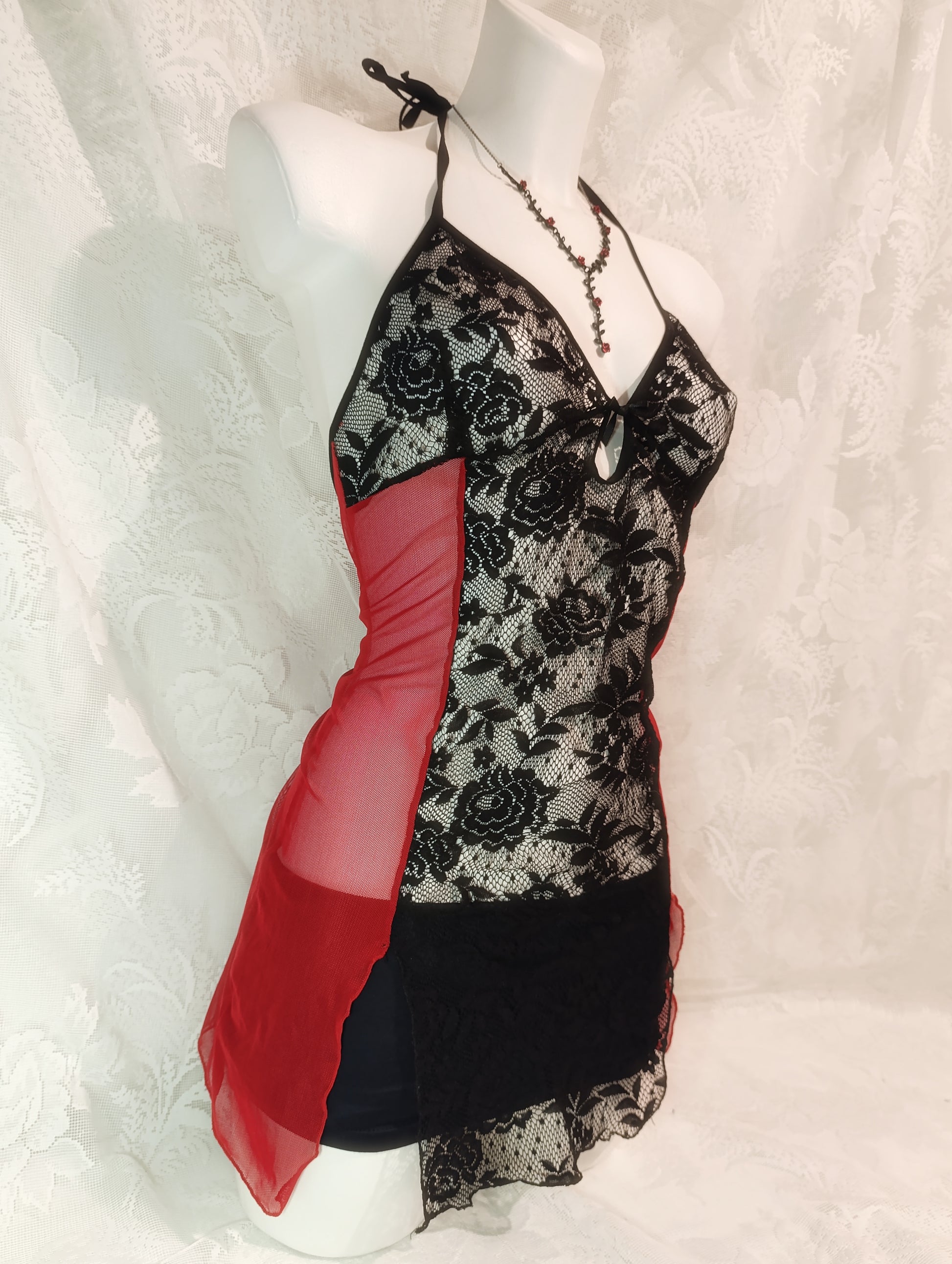 Bieliźniana bluzka / koszulka nocna z koronką w róże i czerwoną siateczką, z dekoltem typu halter wiązanym na szyi ₍ᐢ._.ᐢ₎♡