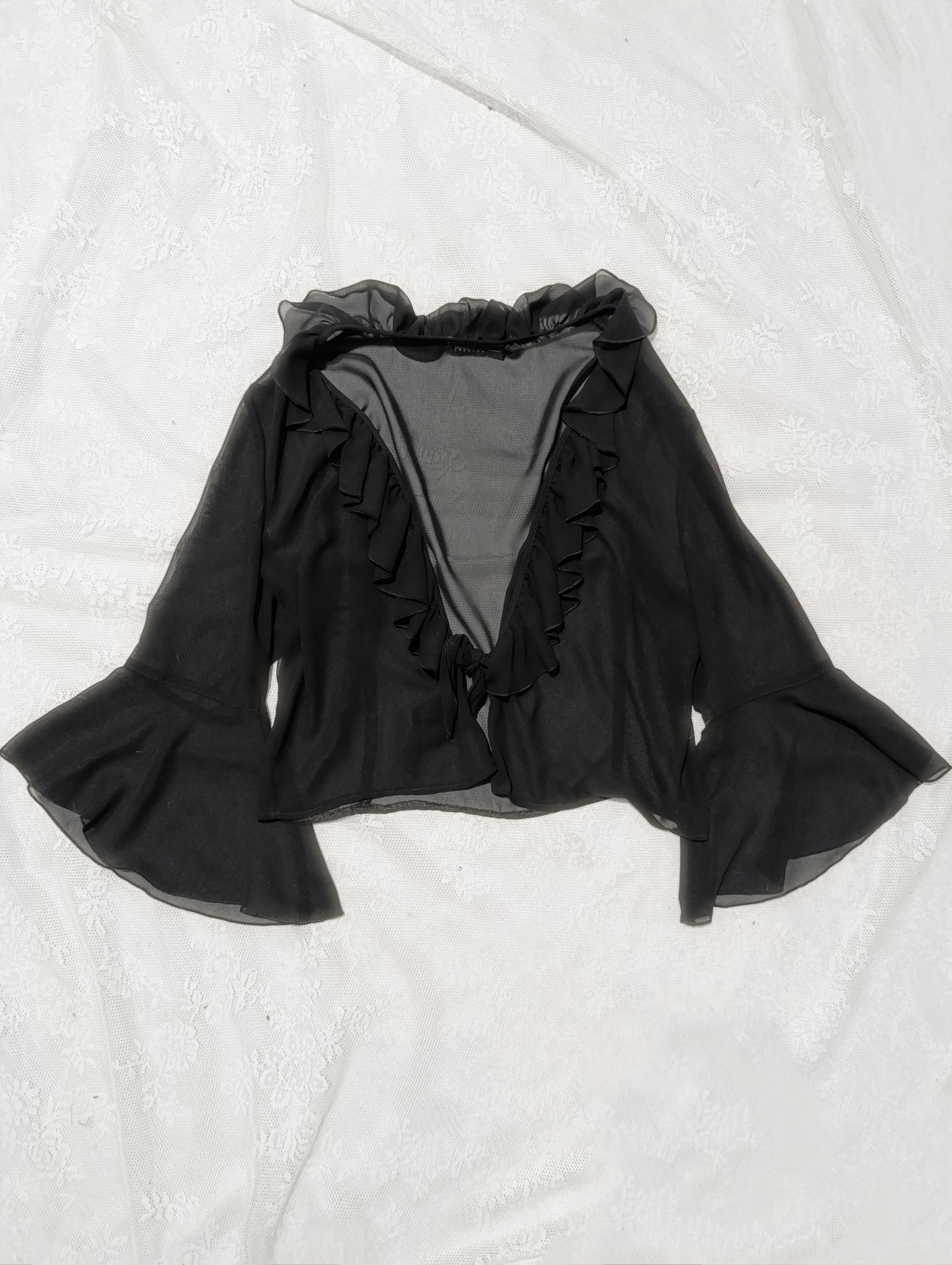 Eleganckie, półprzezroczyste bolerko z szerokimi rękawami 3/4 i falbanką przy dekolcie 𓆩♱𓆪