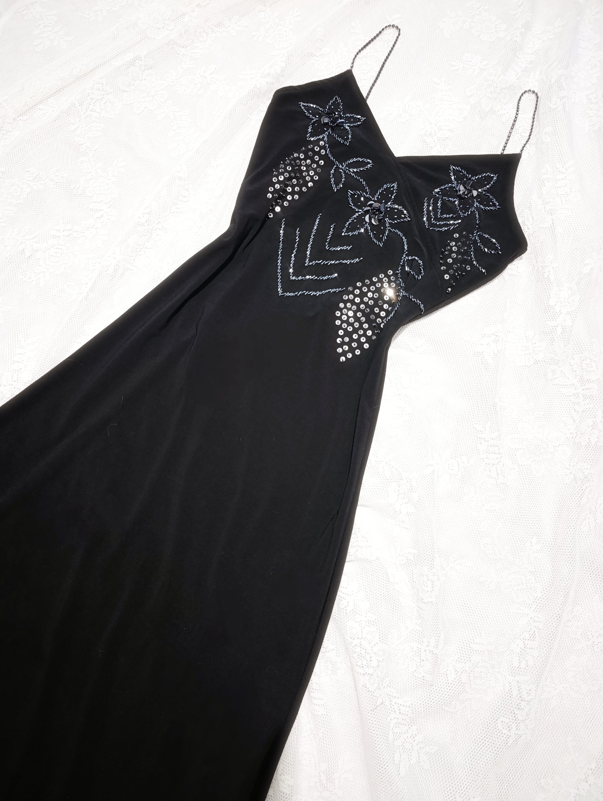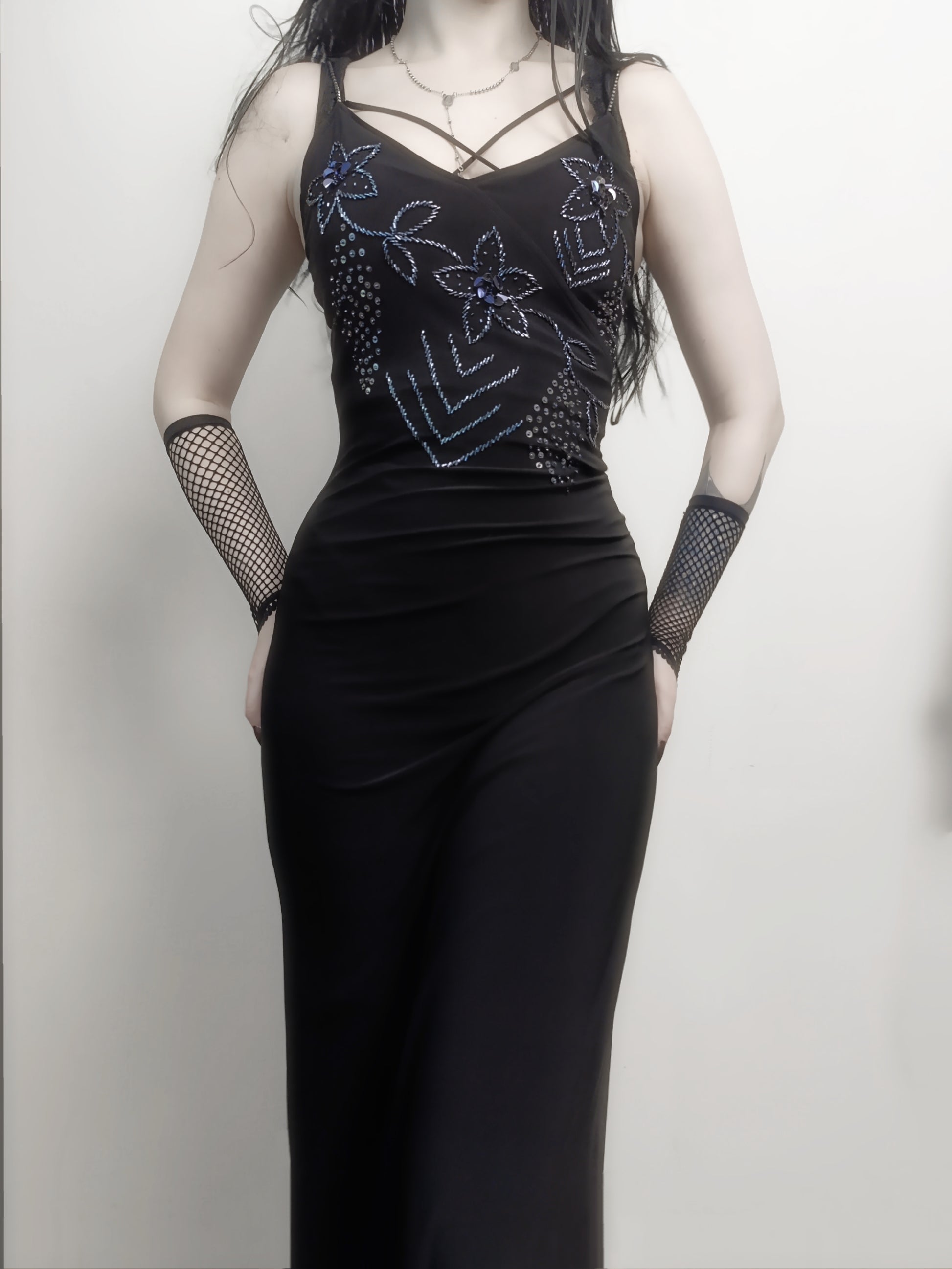 Sukienka maxi z cekinów i koralików, dopasowana do sylwetki 𓋹